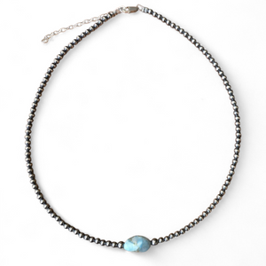 Not native made. Made in the USA. 3mm sterling silver pearls. 4mm sterling pearls surrounding one golden hills turquoise bead in the center. 15 inch necklace plus 2 inch extender totaling 17 inches max.