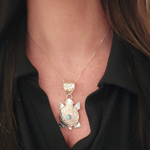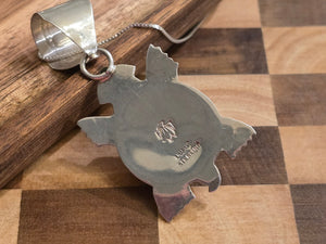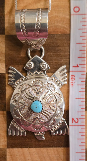 Native made, turquoise and sterling pendant. Large Bail. Comes with 18 inch sterling chain. Made by Alonzo Mariano.