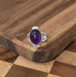 Native made, amethyst and sterling ring. Size 6.75. Made by Alberta Yazzie signed AR Yaz. Stamped sterling.