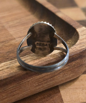 Native made, black onyx and sterling. Signed Begay. Stamped sterling. Size 9.