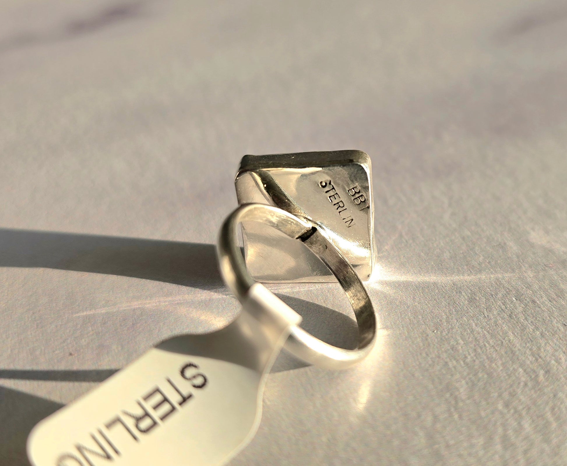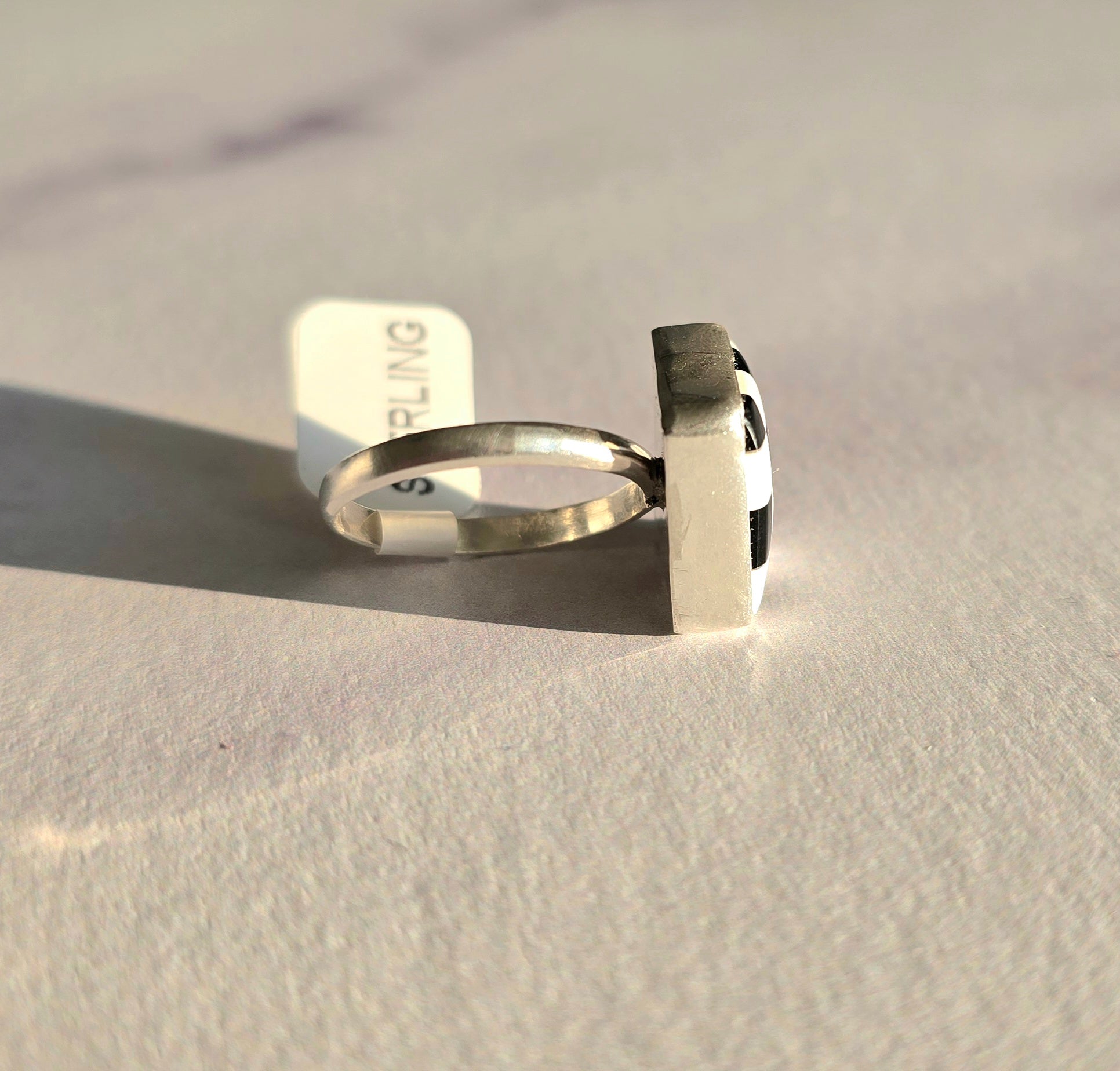 Native made, black and white checkered cab & sterling. Signed by Bernie Begay Tsosie. Size: 8.5.