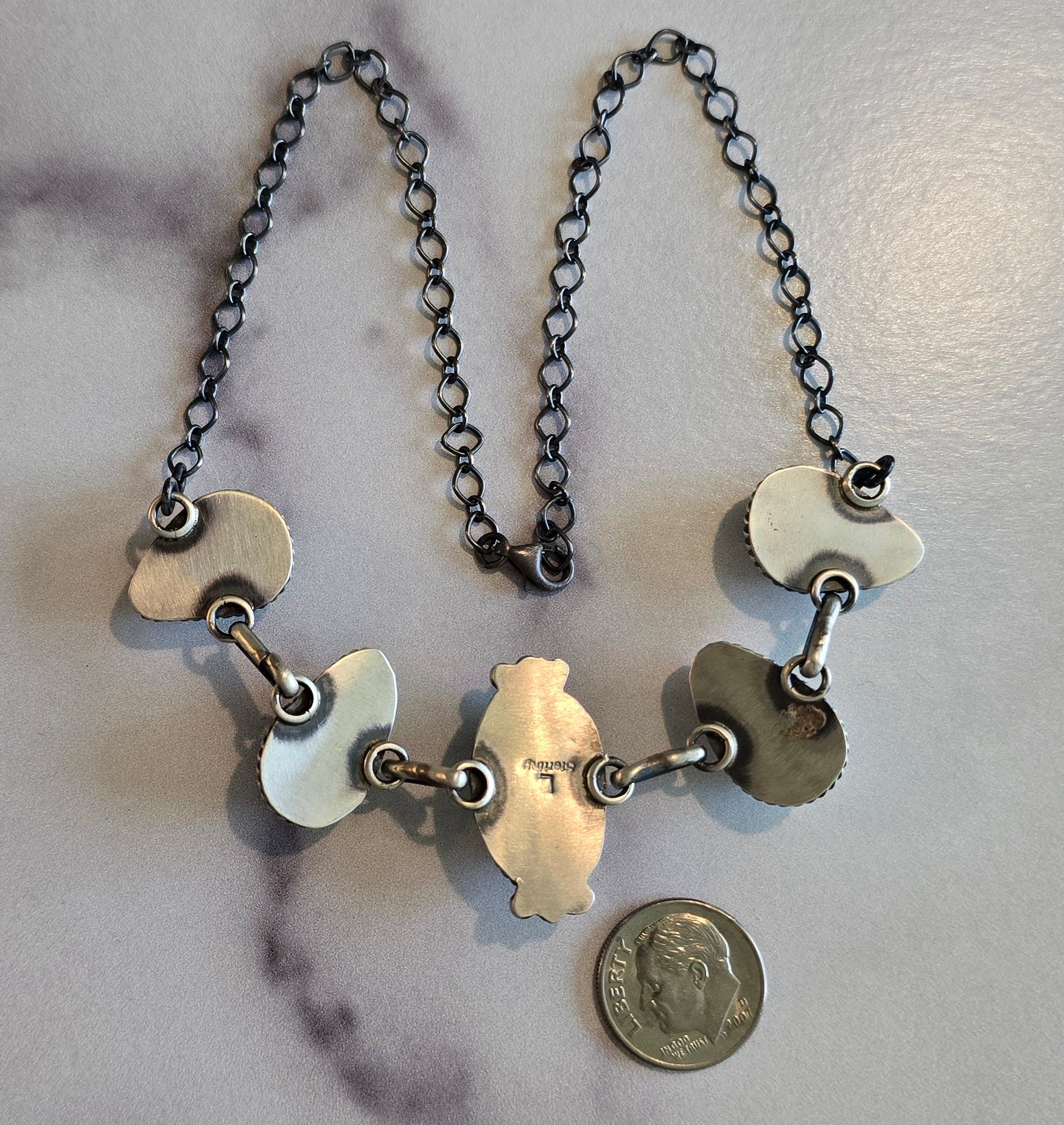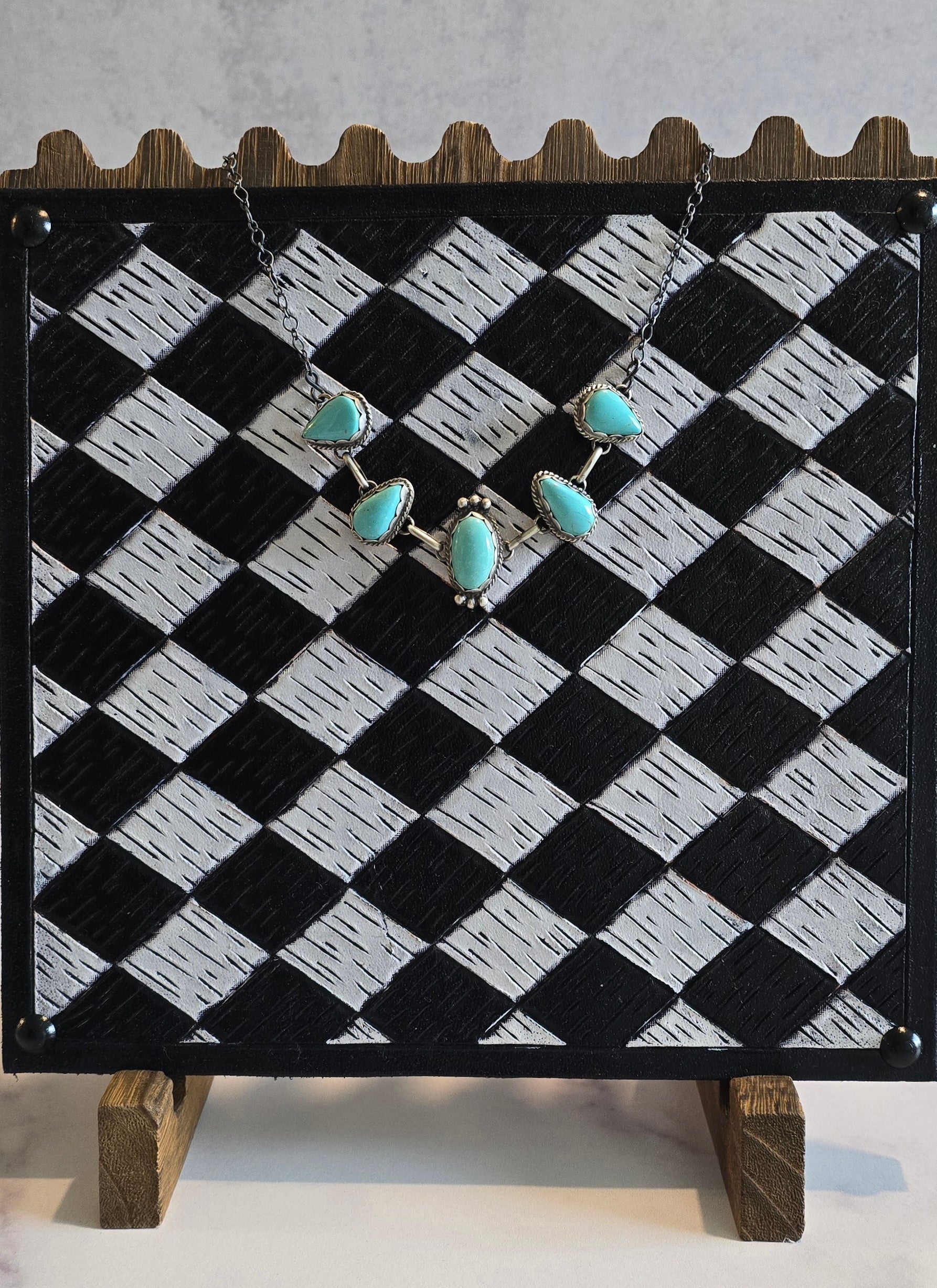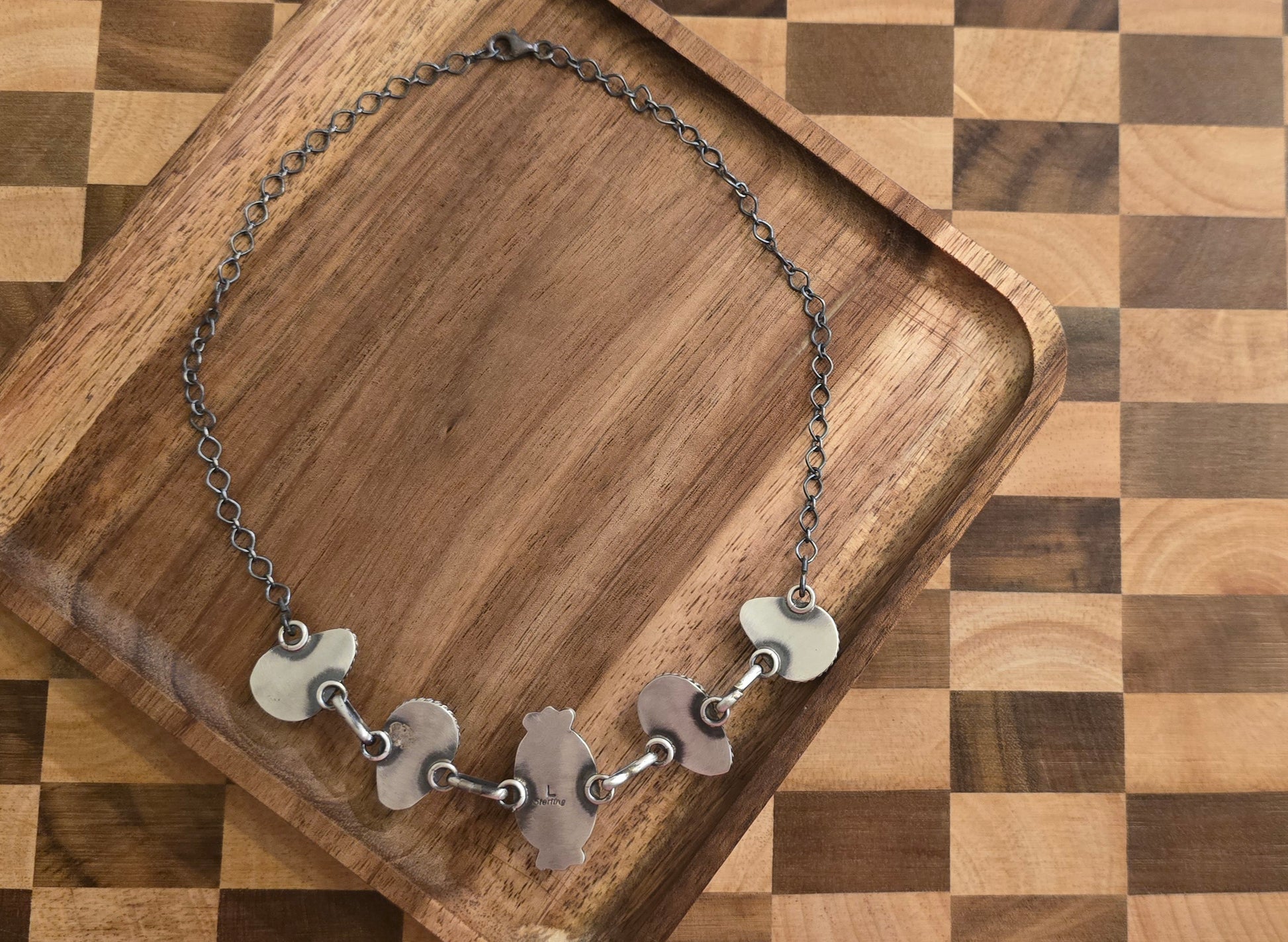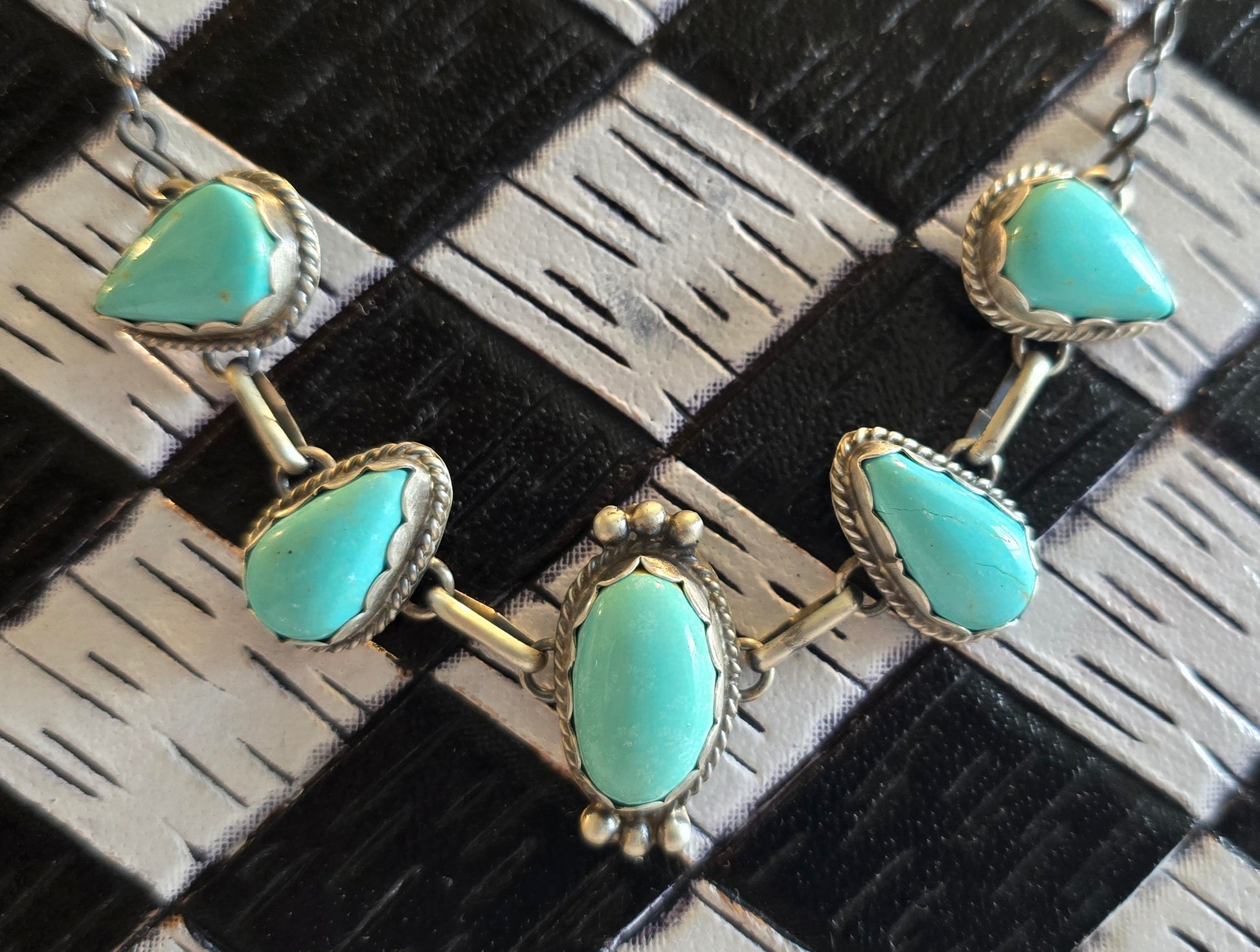 This exquisite choker necklace is a true work of art handcrafted by Native American artisan LeTricia Largo. The stunning choker features beautiful blue glacier turquoise stones set in sterling silver bezel. It is 15-inch in length (can be adjusted to any size shorter) with lobster closure, making it a perfect accessory for any occasion.