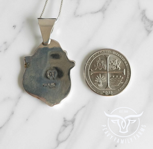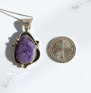 Native made, charoite and sterling pendant. Signed by CT. Includes an 18 inch sterling chain.