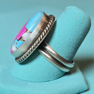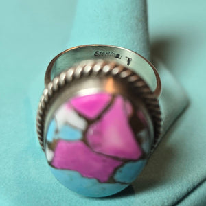 Cotton candy dahlia and sterling adjustable ring. Signed by Tricia Smith. Adjustable sizes 7-10.