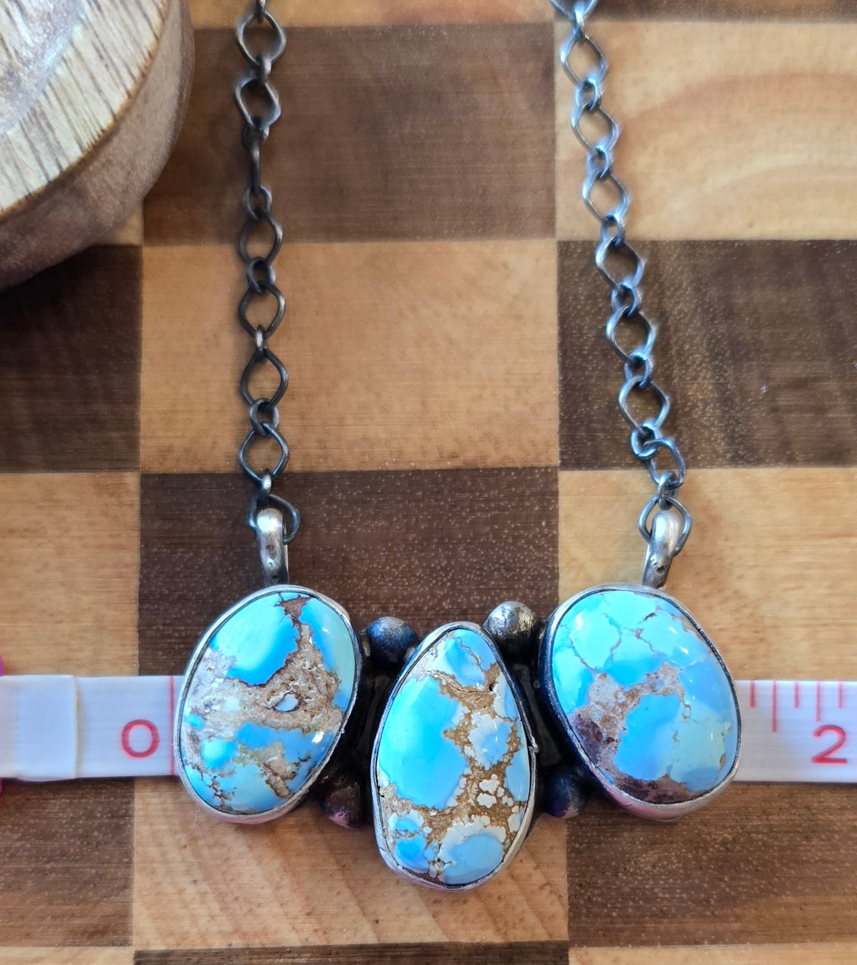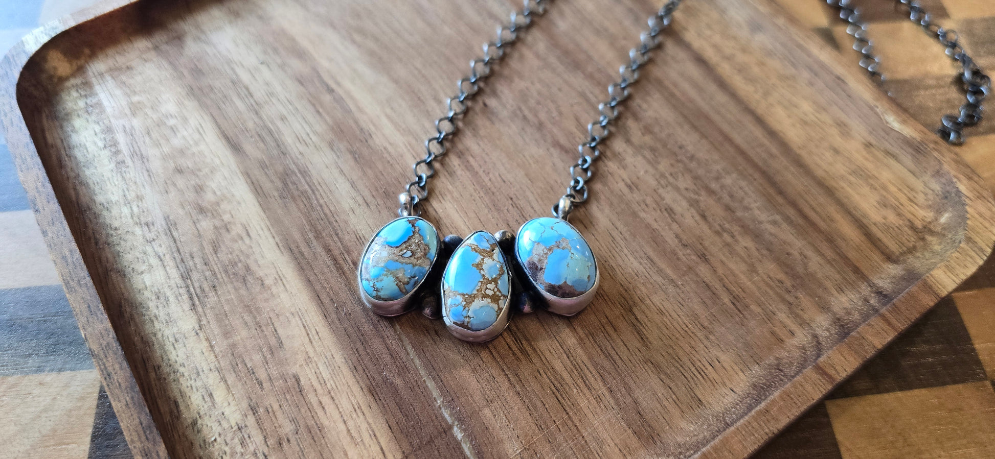 Native Made Golden Hills and Sterling Necklace. The pendant hangs on an 19.5 inch chain with lobster closure. Stamped sterling. Signed by LeTricia Largo.