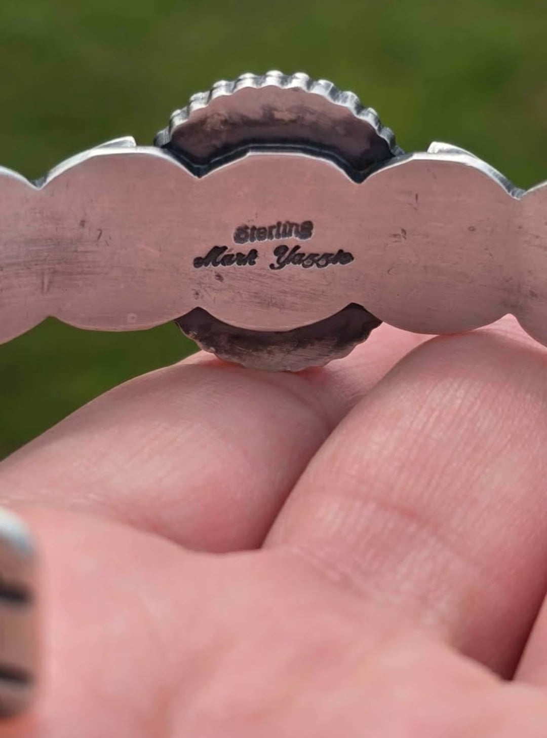 Native made, golden hills turquoise and sterling cuff. Has flex. 5 1/2 inches wide with 1 inch gap. Made by Mark Yazzie.