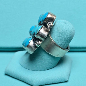 Blue Lone Mountain Turquoise arranged in a traditional cluster pattern. Oxidized sterling silver brings out the brilliant blue of the turquoise. Handmade by Diné silversmith Kathleen Livingston.
