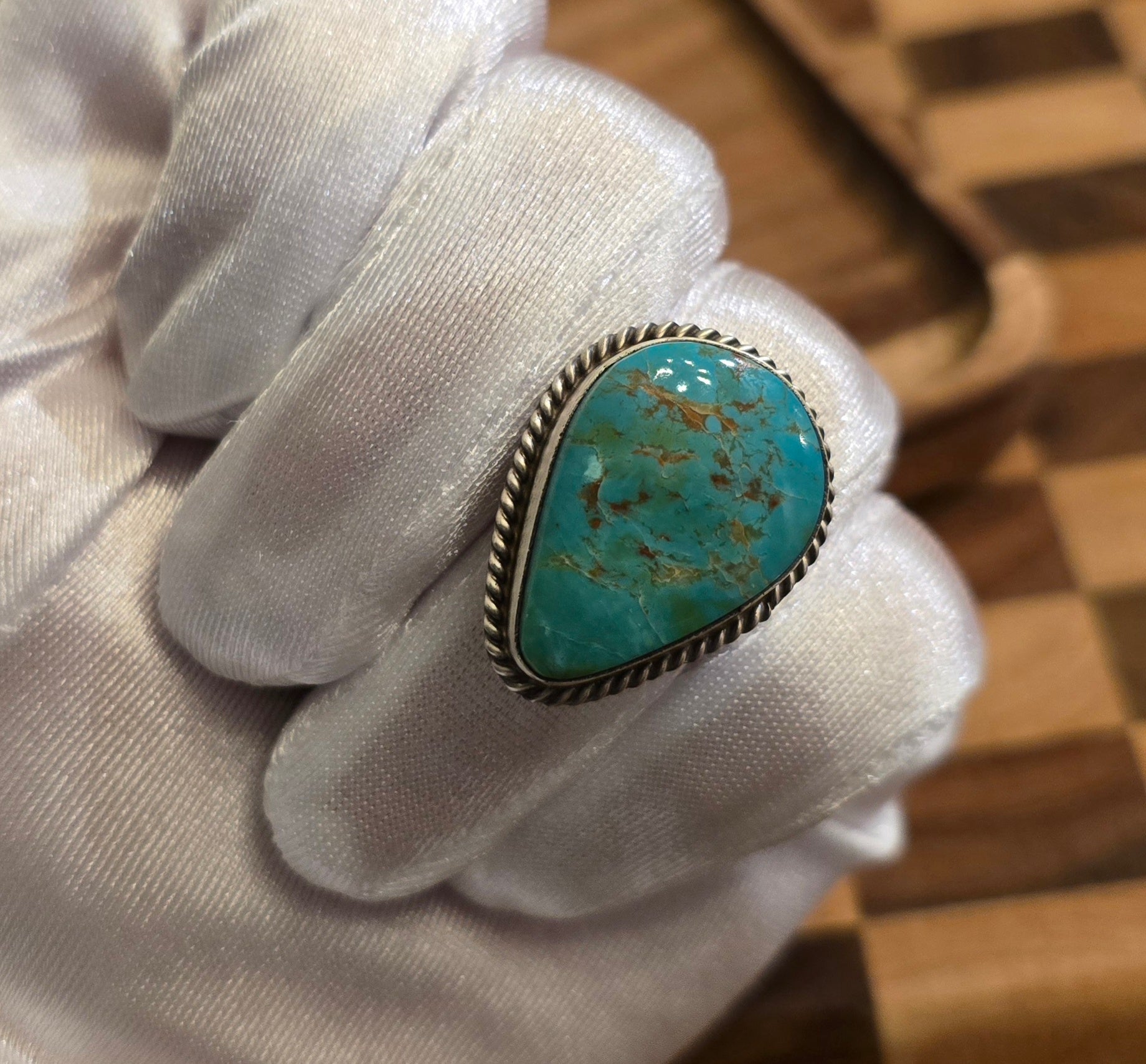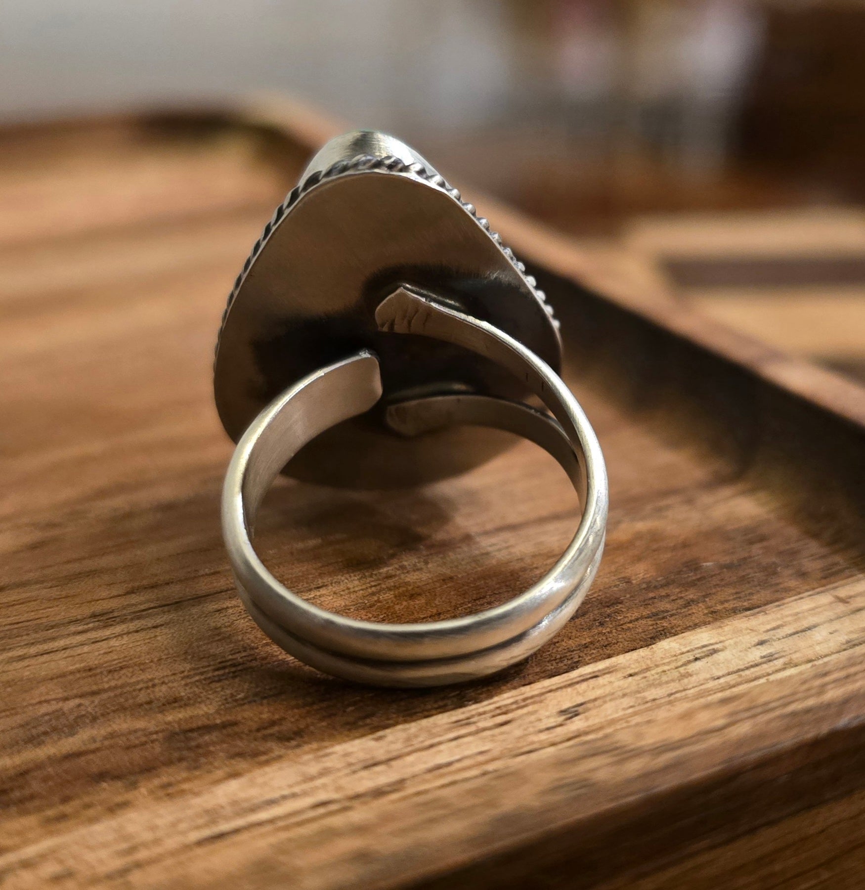 Native made, kingman turquoise and sterling adjustable ring. Signed by Tricia Smith. Adjustable sizes 7-10.