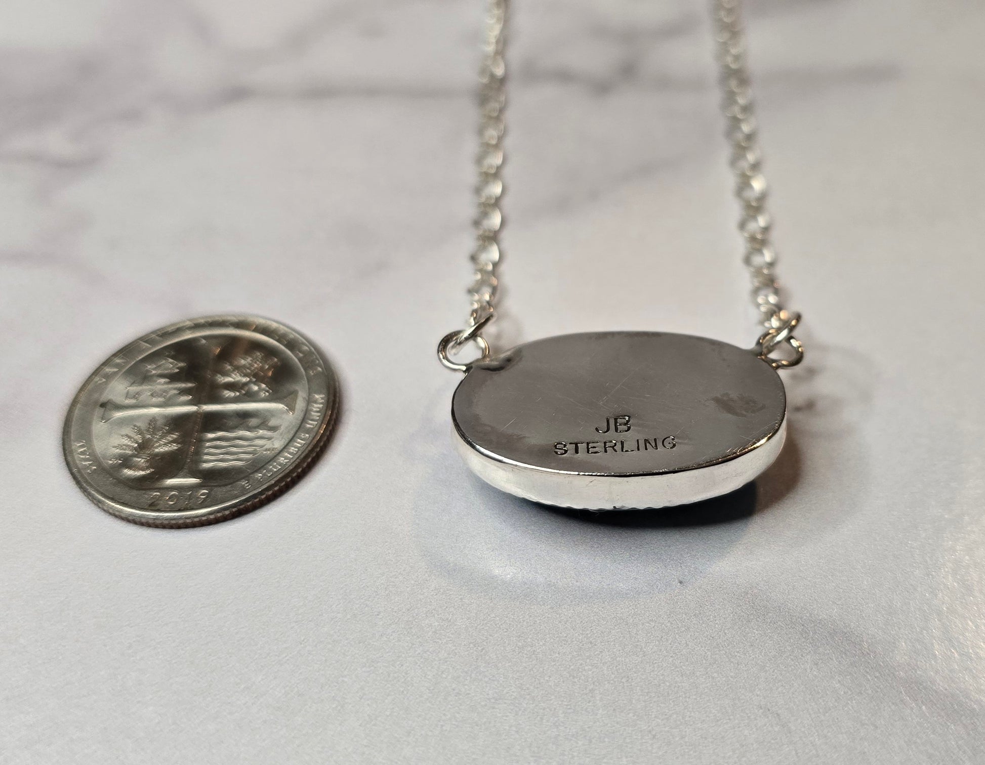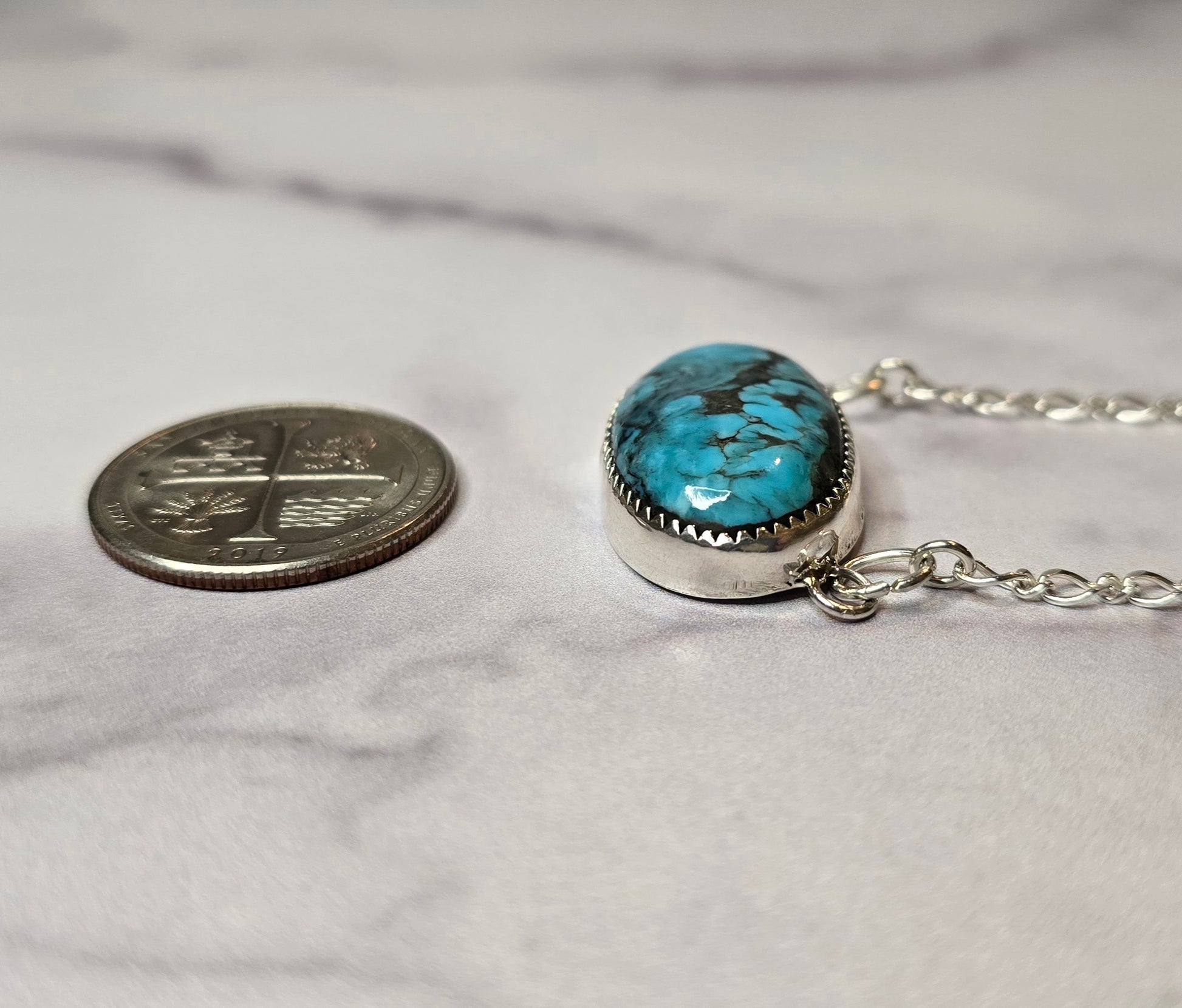 Native made, kingman turquoise and sterling necklace. Max length 20 inches long. Made by Jennifer Begay.