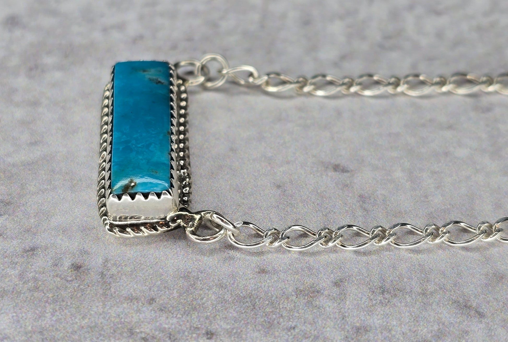 Native made, kingman turquoise and sterling necklace. Max length almost 20 inches. Made by Jennifer Begay.