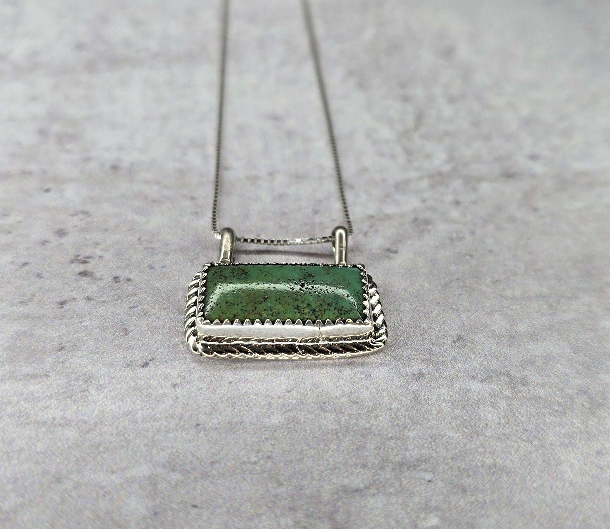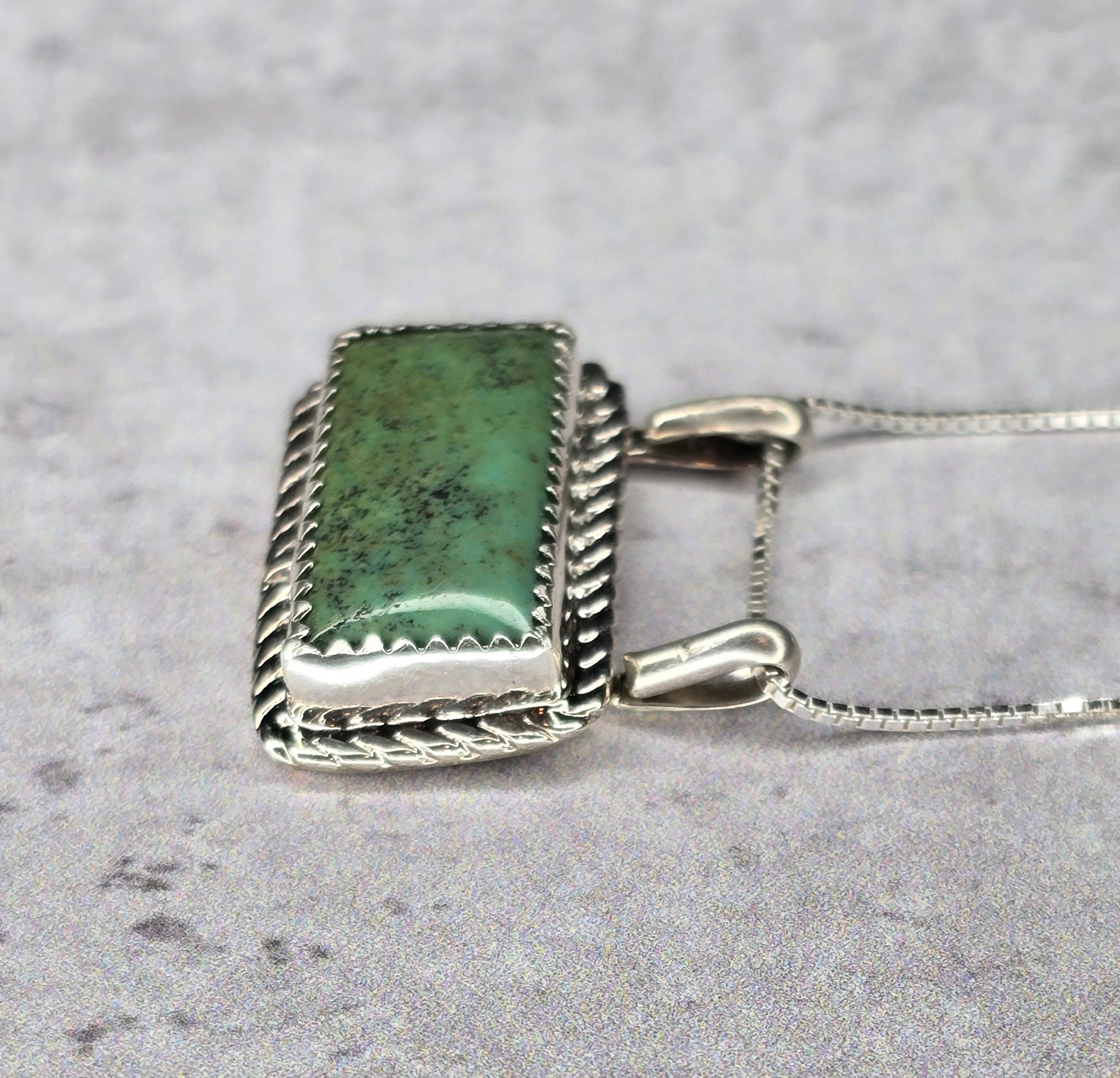 Native made, kingman turquoise and sterling necklace. Comes on 18 inch sterling chain. Made by Jennifer Begay.