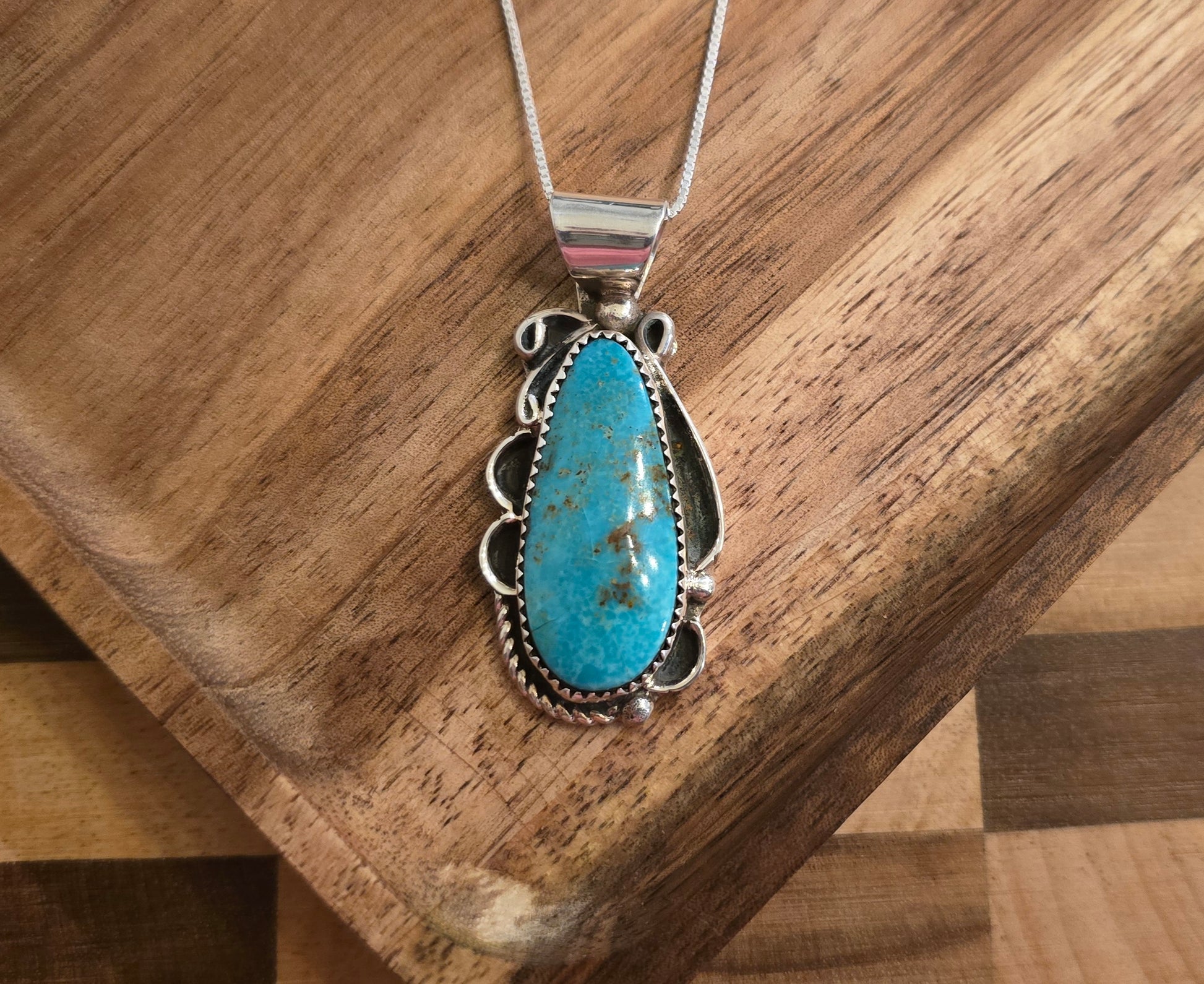 Native made, kingman turquoise and sterling pendant. Signed by CT. Includes 18 inch sterling chain.