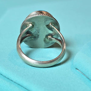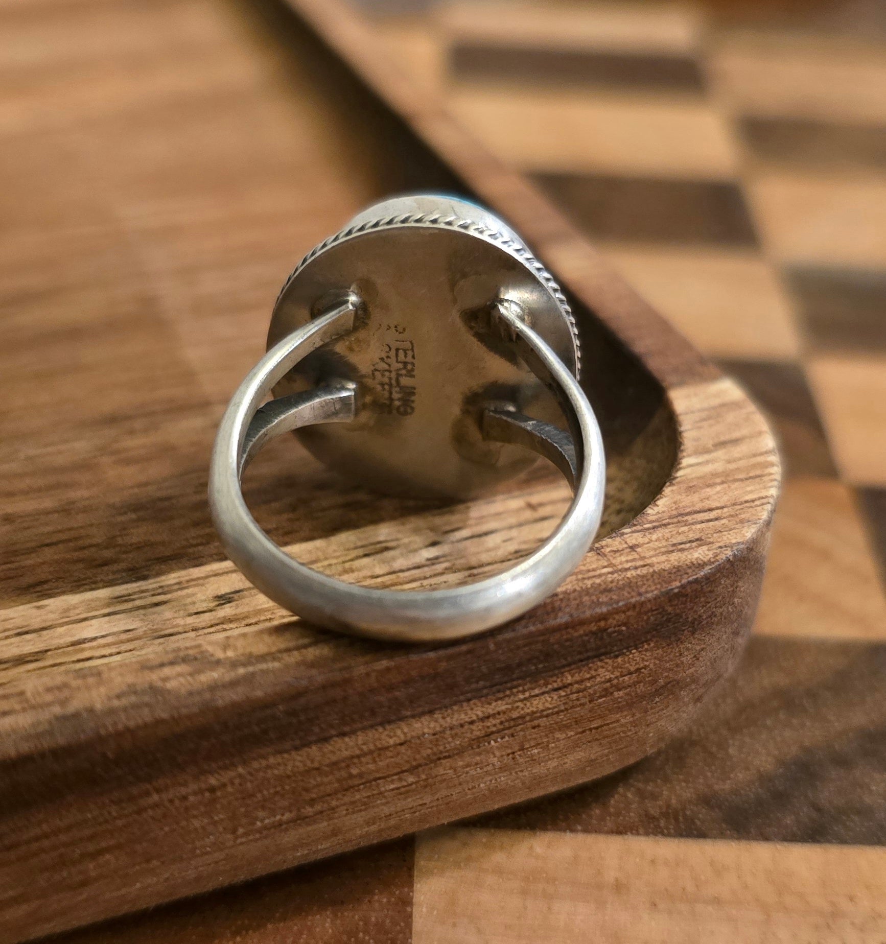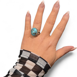 Native made, kingman turquoise with pyrite inclusions and sterling ring. Size 7.25. Made by Scott Skeets.