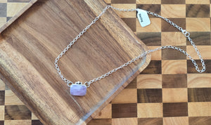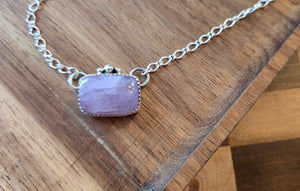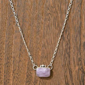 Native made, kunzite and sterling necklace. 19.5 inches max. Made by Alberta Yazzie.