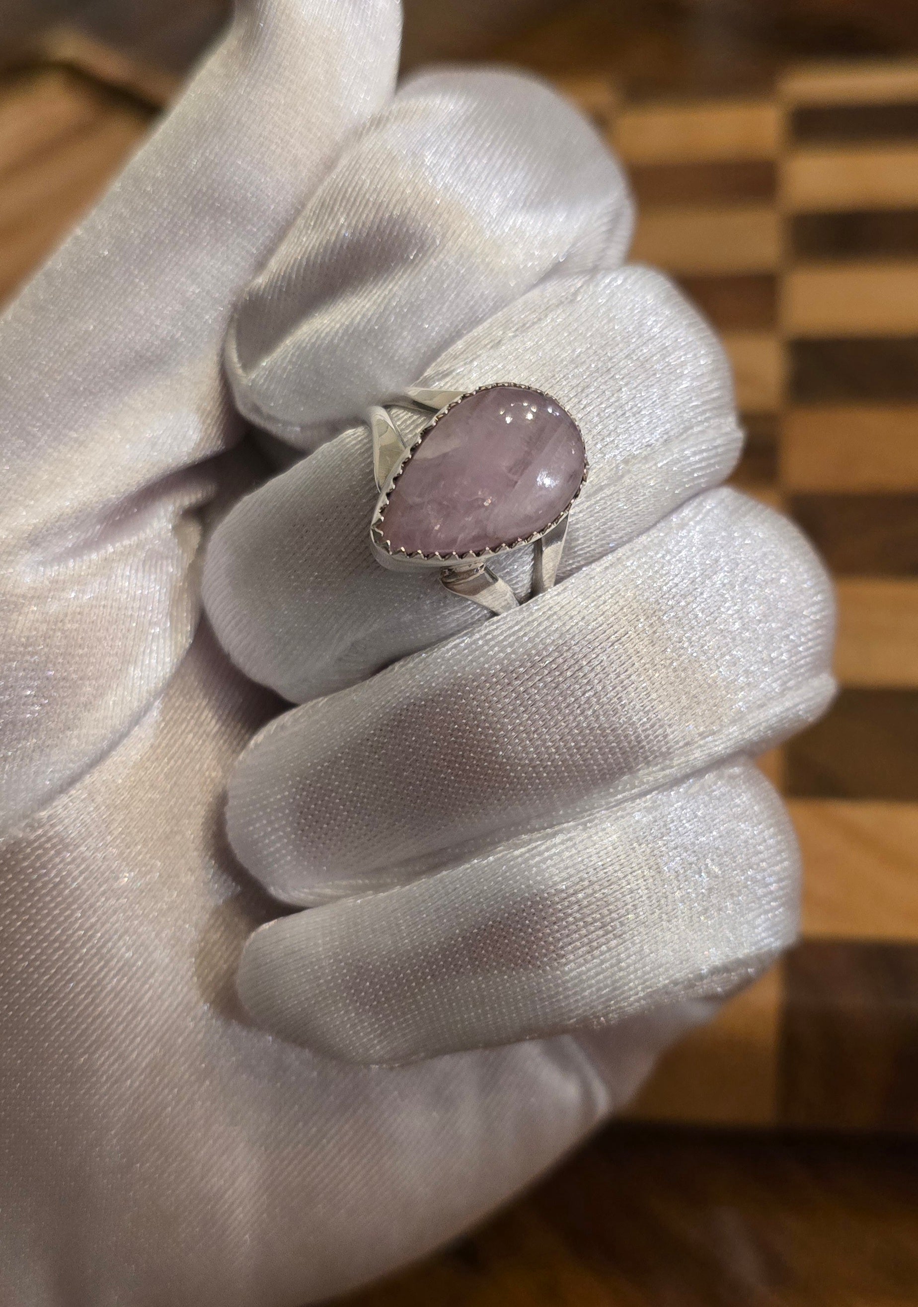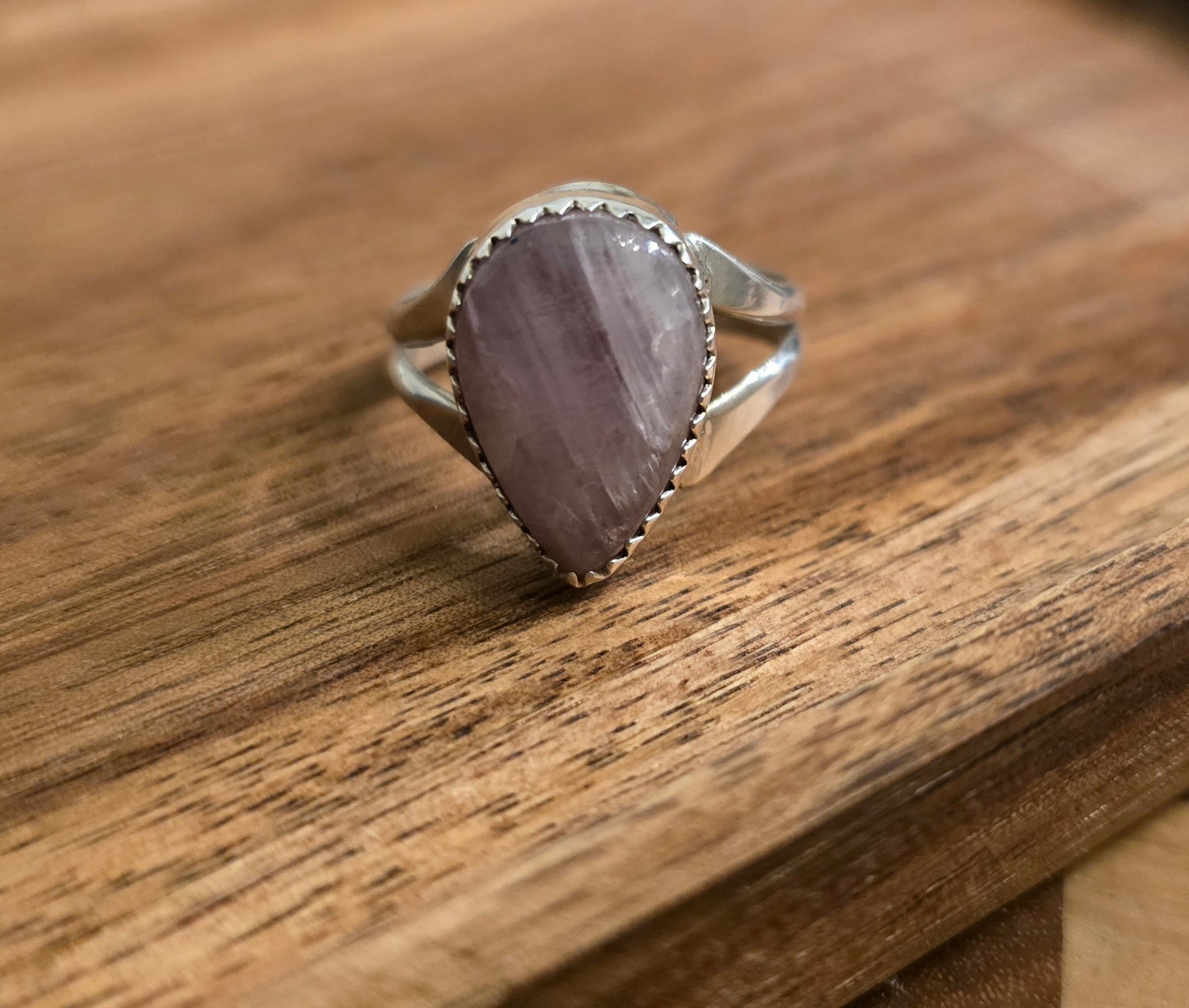 Native made, kunzite and sterling ring. Made by Jennifer Begay. Size 9. (Pictured on ring finger)