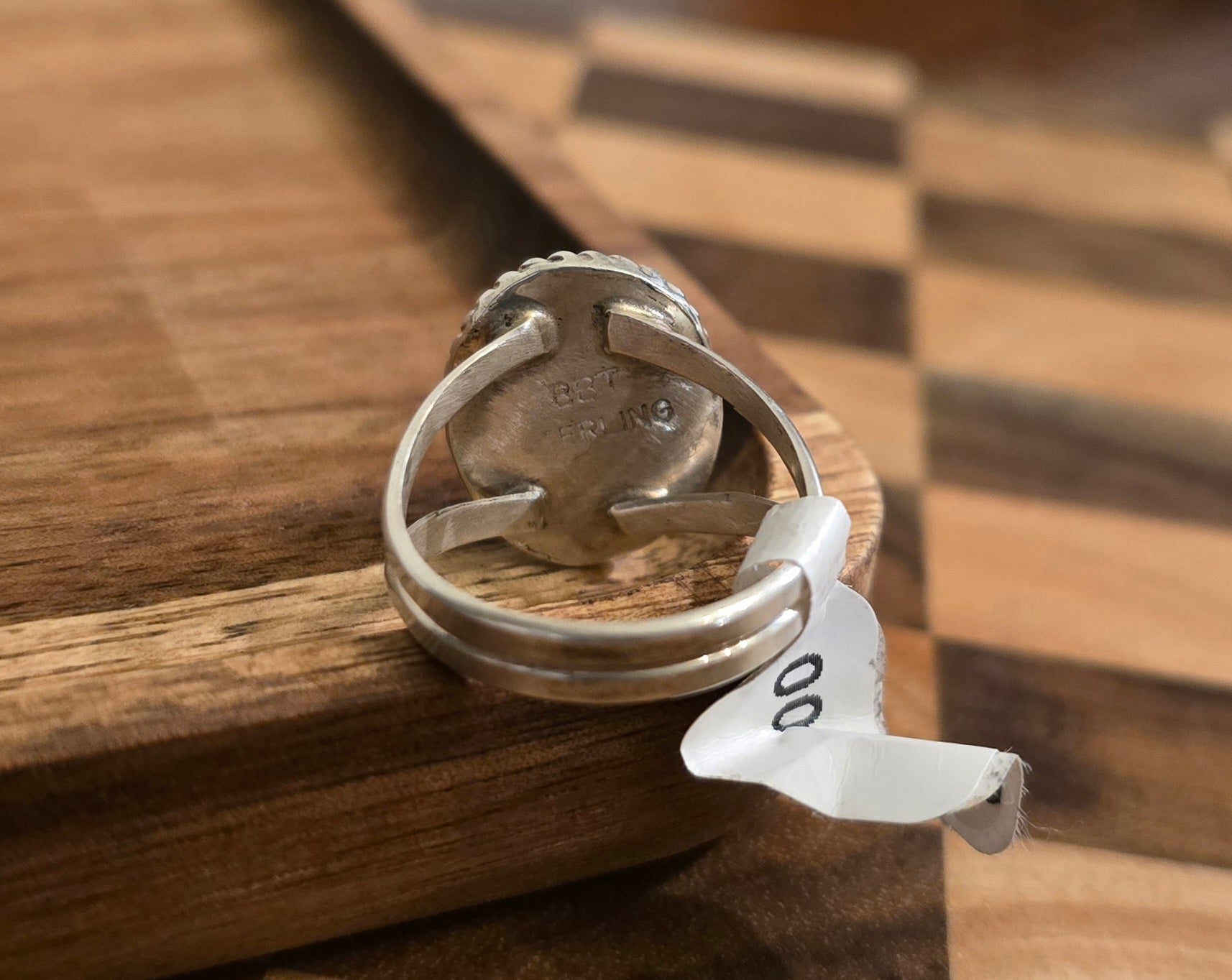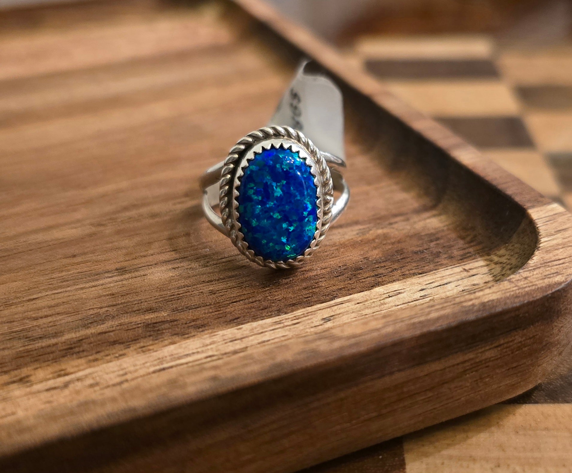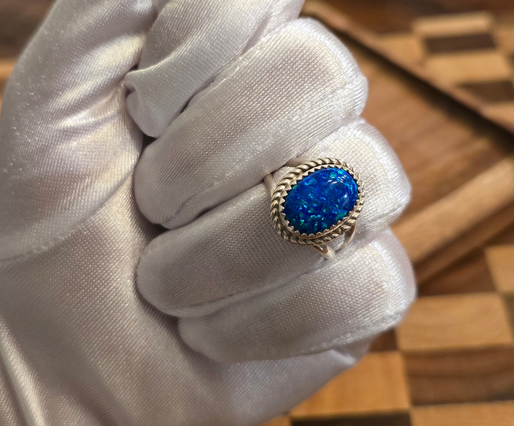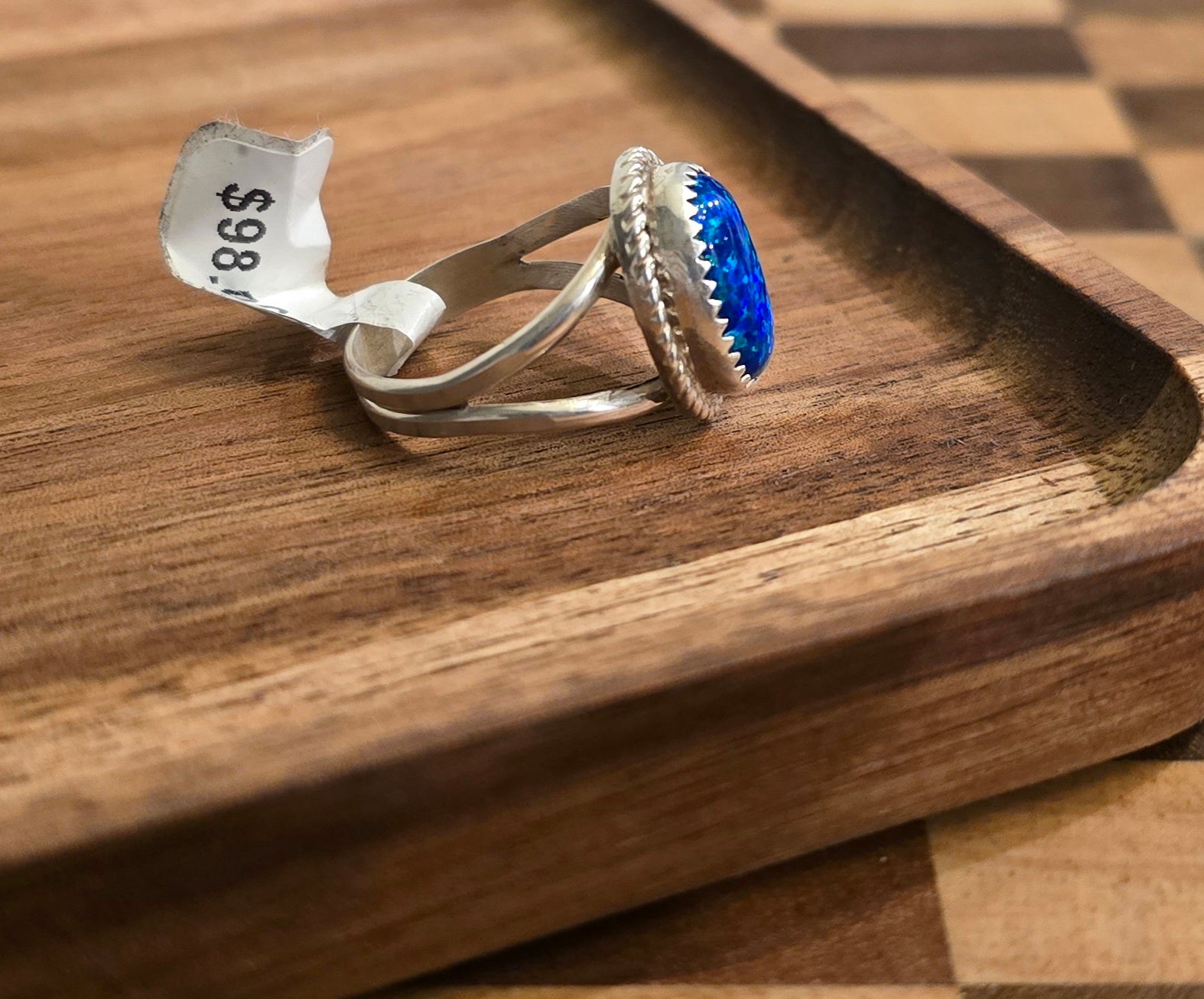 Native made, man made blue opal and sterling. Made by Bernie Begay Tsosie. Size 8.