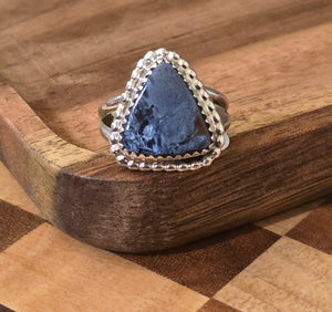 Native made, pietersite and sterling ring. Size 7.25. Signed BBT (hard to see) Bernie Begay Tsosie. Stamped sterling.