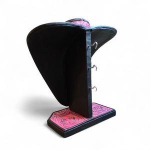 Genuine leather. Ships with base removed to keep from breaking in transit. This is how they are shipped to me as well. Will include the 3 screws to reattach.