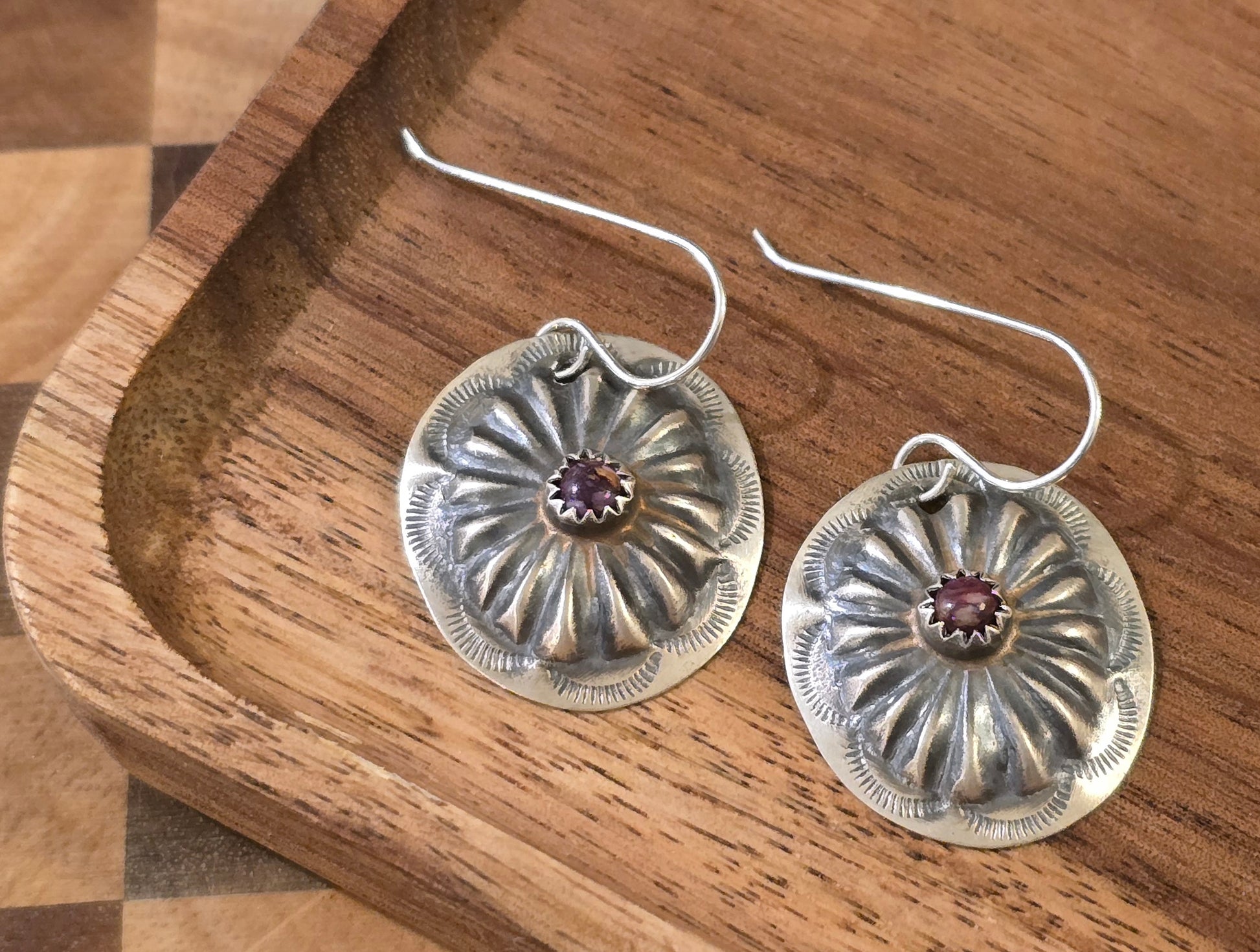 Native made, purple spiny and sterling earrings. Stamped and signed B by artist.