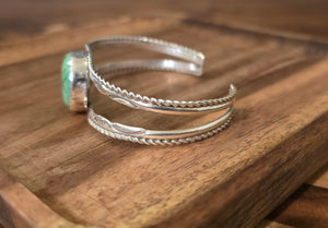Native made, Sierra Bella Turquoise and sterling. Made by Herbert Tsosie. Signed HT. Stamped sterling. Cuff is 5 1/2 inches end to end with a 1 inch gap. Has flex.