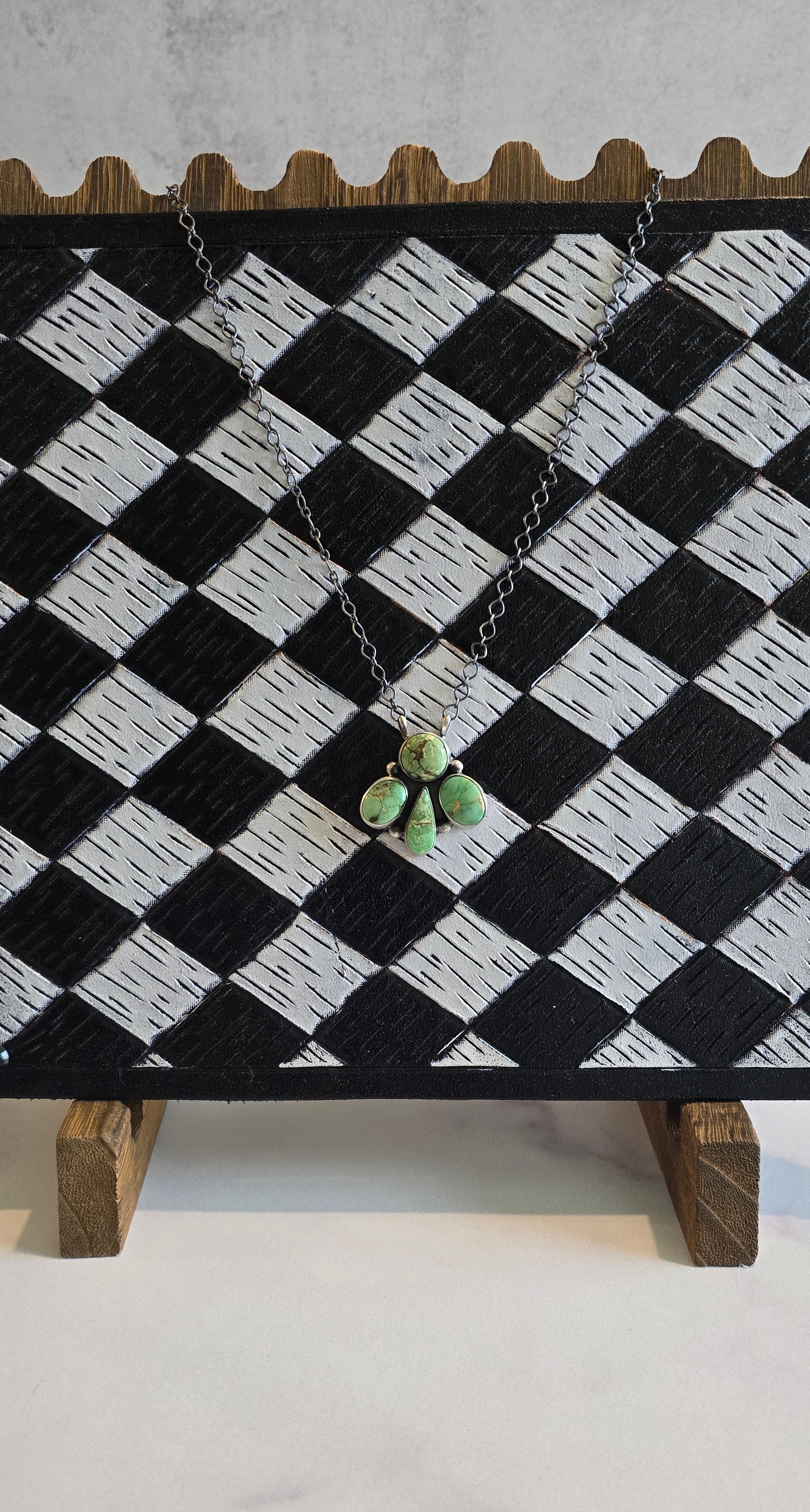 This exquisite necklace is a true work of art handcrafted by Native American artisan LeTricia Largo. The stunning cluster bar shaped necklace features beautiful sonoran gold turquoise stones set in sterling silver bezel. The pendant hangs on an 18-inch chain with lobster closure, making it a perfect accessory for any occasion.