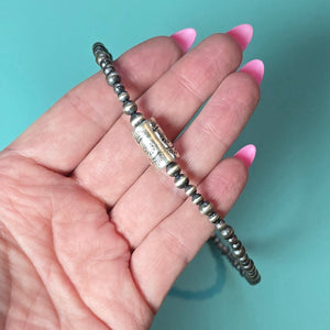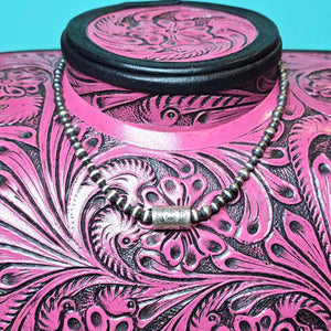 Not native made. Hand strung. 4 and 5mm sterling pearls. Sterling barrel bead. Sterling findings. 16 inches max.