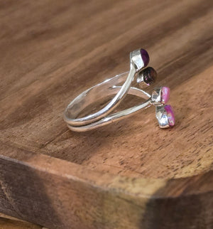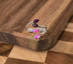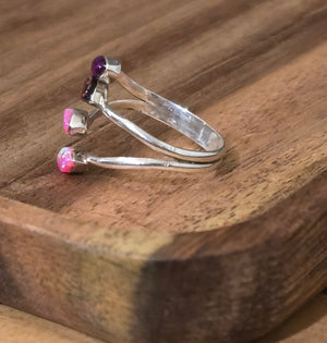 Native made, sterling, pink & purple opal. Sits at a 7.25 but can open up more to about a 7.5. Not stamped but tested sterling.
