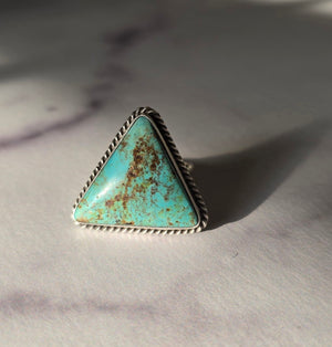 Native made, kingman turquoise and sterling adjustable ring. Signed by Tricia Smith. Adjustable sizes 7-10.